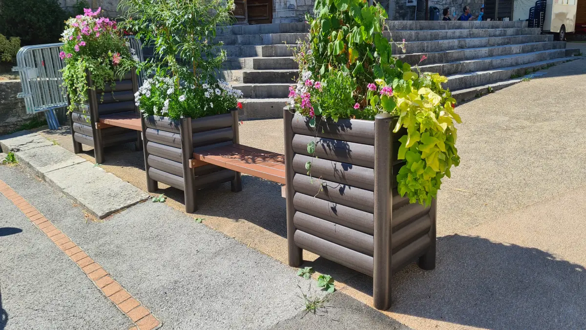 ensemble jardinières et bancs publics