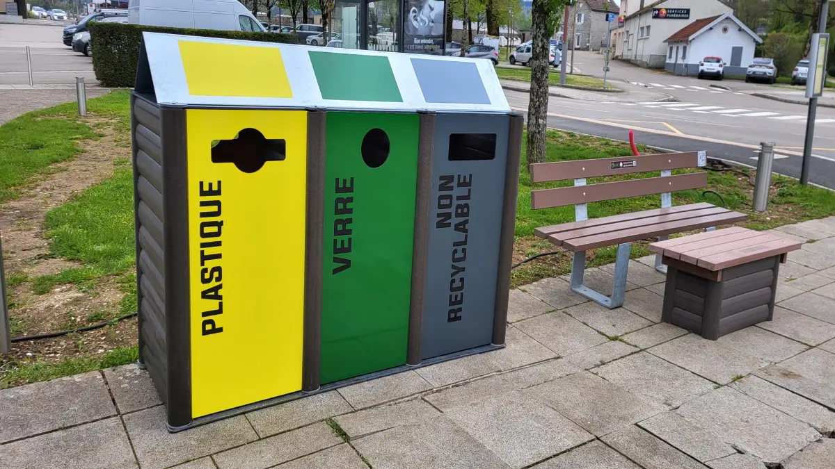 ensemble habillage bacs de tri, banc et table basse